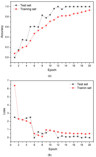 The learning (a) accuracy and (b) loss of the CNN model for 20 epochs.