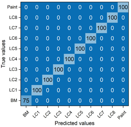 Figure 7 shows the learning accuracy and loss of the CNN model after 20 epochs. The learning accuracy improved to 100%, and the loss decreased to zero after 20 epochs. Figure 8 shows the confusion matrix after 20 epochs. The LIBS spectra analysis with the CNN model shows a perfect classification for every specimen (i.e., BM for seventy-five predictions and painted and LC specimens for one hundred predictions). In other words, the predicted values of the CNN model agreed perfectly with the true values without prediction errors. These results verified that excellent classification accuracy of the BM, painted, and LC specimens was achieved using the LIBS spectra analysis with the CNN model.