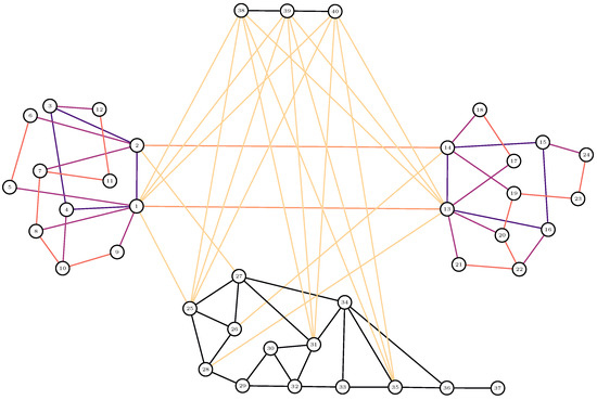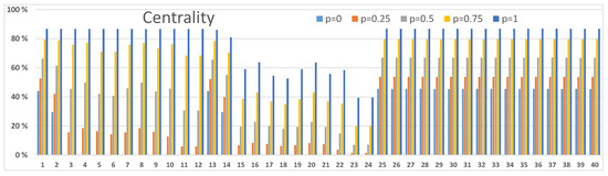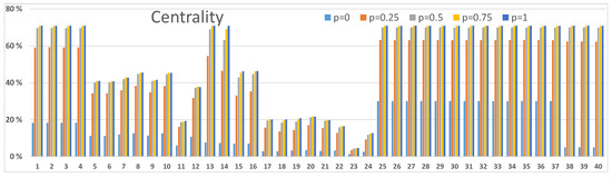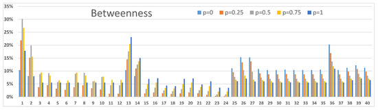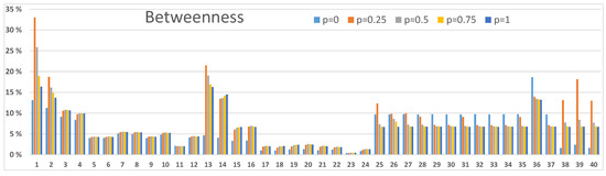 Our second example in Figure 8 shows somewhat different betweenness results. Nodes 1 and 13 have high betweenness values with the higher values of and respectively. Node 36, again, has a high betweenness value for low p values. Betweenness values of satellite nodes and 40 have maxima for lower values of p than in Figure 6 and their role is not particularly important anymore.