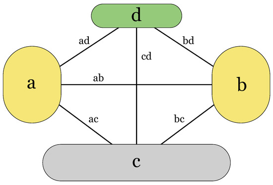 In this section, we investigate the effects of varying resilience between the four networks of Figure 1. Table 2 shows the connections that are available between the networks in the calculations of Figure 3. For example, the first row of Table 2 indicates that all six types of connections marked as ab, ac, bc, ad, bd, and cd are available. The symbol ab denotes the connections between networks a and b, and so on.
