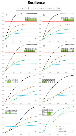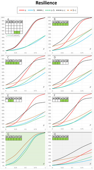We only provide the results of Figure 3H for the resilience of connections between the access networks a–b because, in these cases, all network resilience values a, b and c were constant as a function of p.