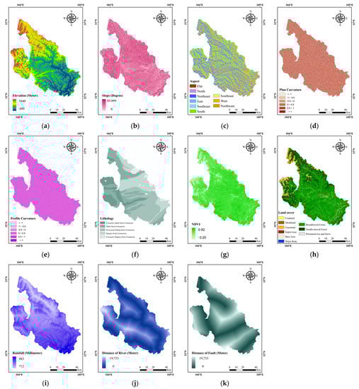 | Elevation | Slope | Aspect | Plan Curvature | Profile Curvature | Rainfall | NDVI | Lithology | Landcover | Distance of River | Distance of Fault | |