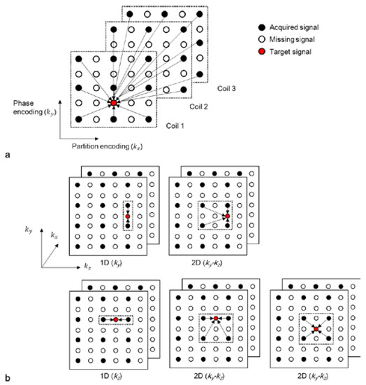 - Wang, Z.; Fernández-Seara, M.A. 2D partially parallel imaging with k-space surrounding neighbors-based data reconstruction. Magn. Reson. Med. 2006, 56, 1389–1396. [Google Scholar] [CrossRef]