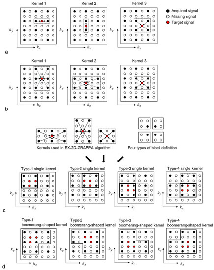 In the single-kernel (SK)-2D-GRAPPA algorithm, RyRz–1 missing data points are simultaneously reconstructed with a single square kernel [24]. Kernels in [20,21] could be considered as an extension of the basis kernel of the SK-2D-GRAPPA algorithm. The process of composing a square kernel is shown in Figure 3c. Given that the kernels of the EX-2D-GRAPPA algorithm are arranged to reconstruct a block, a kernel that uses the common acquired data points utilized with the kernels of the EX-2D-GRAPPA algorithm is defined as a square kernel. One of the four types of square kernels can be generated depending on the definition of a block.
