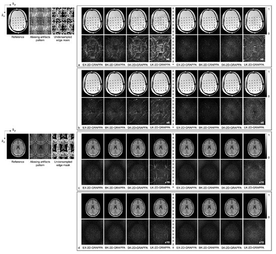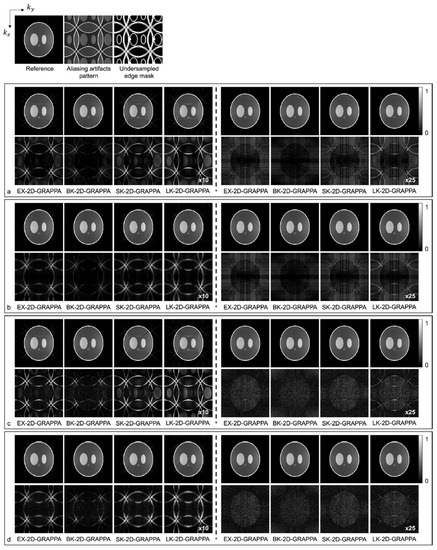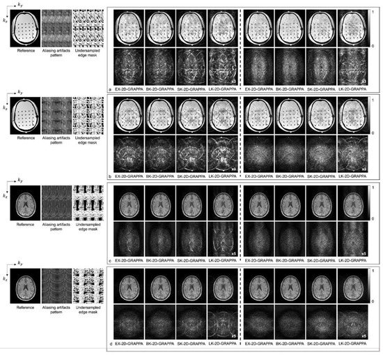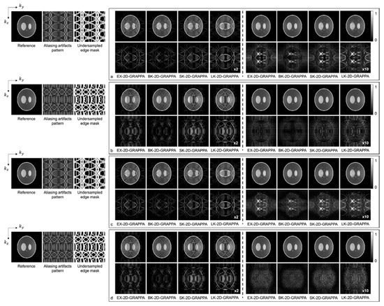 Figure 6 shows images reconstructed from the acquired phantom (a,b) and human brain (c,d) data. The reference image reconstructed from fully sampled k-space data, an image showing the pattern of aliasing artifacts and an undersampled edge mask are also presented on the left. The missing k-space data were estimated from acquired data with 24 × 24 k-space reference lines to generate the final images, and the difference images were also calculated by subtracting the reconstructed images from the reference image. In Figure 6a,c, the images show the reconstruction results obtained when the k-space reference lines were excluded before reconstruction. On the other hand, Figure 6b,d shows images obtained when the reference lines were included for reconstruction. Images from the first to the fourth columns were reconstructed with the basis kernels, and images from the fifth to eighth columns were reconstructed with the expanded kernels using the 2D-GRAPPA algorithms named below. In the reconstructed images of the acquired phantom data, the BK-2D-GRAPPA algorithm eliminated more aliasing artifacts than other 2D-GRAPPA algorithms. It was difficult to visually observe significant differences between different algorithms except for the LK-2D-GRAPPA algorithm, which showed severe artifacts in the reconstructed images of in vivo data. Nevertheless, the BK-2D-GRAPPA algorithm showed fewer errors when compared with the reference image than other 2D-GRAPPA algorithms.