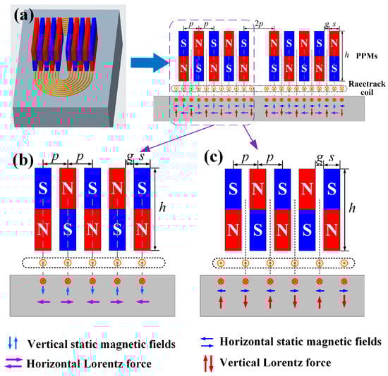 The structure of the developed PPM EMAT is different from the conventional SH wave EMAT, although both consist of a racetrack coil and a group of periodic permanent magnets. The magnet units in SH wave EMAT are arranged overhead the wires in the same direction as the excitation current. As a result, the Lorentz forces are tangential and vary with the polarities of magnet units. In Figure 1a, the magnet units are laid in the same direction as the wires. Then the direction of Lorentz forces is determined by the location of the wires. The wires beneath the magnet units mainly generate tangential Lorentz forces, and the wires beneath the gaps mainly generate normal ones, as shown in Figure 1a. It is inferred that the wires beneath the magnet units generate in-plane (IP) displacements and the wires beneath the gaps cause out-of-plane (OP) displacements. In order to distinguish the contribution of Lorentz force direction to the Lamb wave modes, the proposed EMAT is divided into two idealized categories. One is the wire-beneath-magnet (WBM) EMAT, as shown in Figure 1b, in which the wires are aligned with the magnet units. The other is the wire-beneath-gap (WBG) EMAT, as shown in Figure 1c, in which the wires are aligned with the gaps between magnet units.