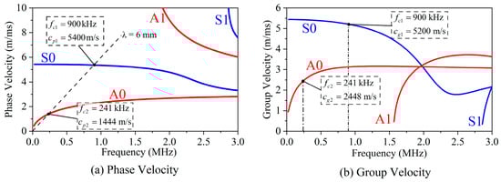 In this paper, a 1-mm-thick aluminium plate is employed as the sample. Magnet units (neodymium-iron-boron, Nd-Fe-B) have a size of 2 mm × 10 mm × 50 mm and a spacing p of 3 mm. Therefore, the wavelength of the targeted mode wave is 6 mm. Figure 2 shows the dispersion curves of ultrasonic Lamb waves in a 1-mm-thick aluminium plate. According to Equation (3), the theoretical center frequencies of S0 and A0 modes can be calculated to be fc1 = 900 kHz and fc2 = 241 kHz, respectively. The phase and group velocities of the S0 mode are cp1 = 5400 m/s and cg1 = 5200 m/s. The phase and group velocities of the A0 mode are cp2 = 1444 m/s and cg2 = 2448 m/s. This means that the output displacements of the WBM and WBG EMAT maximize at 900 kHz and 240 kHz, respectively. Then, the generated Lamb wave of the proposed EMATs in Figure 1a is investigated in the following simulations and experiments.