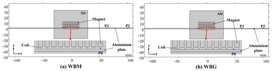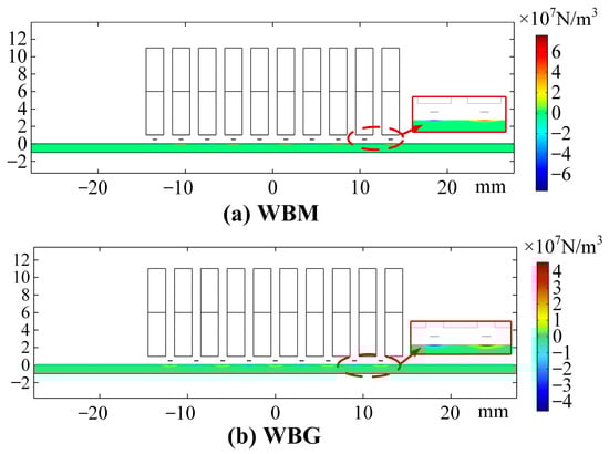 The wires in the WBG model are aligned with the gaps between adjacent magnets. The Lorentz forces originated from the horizontal magnetic fields, and the eddy currents have vertical components larger than the horizontal ones. In Figure 9b, the maximum values of FLx and FLy are −0.011 × 107 N/m3 and 4.264 × 107 N/m3, respectively. The ratio of the maximum values of FLy to that of FLx (ηWBM(y_x)) is about 388.