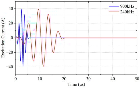 where A0 is the amplitude of the excitation current, f the excitation frequency, T the period, and n the number of periods. The current signals at 900 kHz and 240 kHz are respectively used in the WBM and WBG models, as shown in Figure 4.