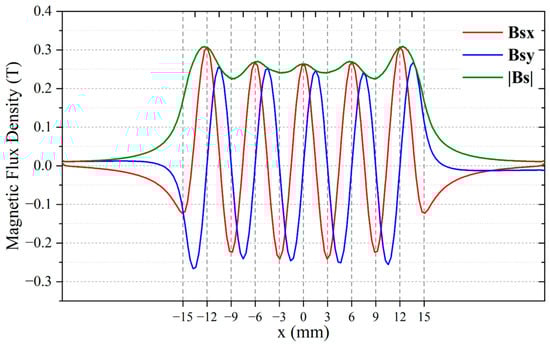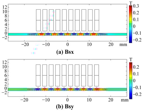 The WBM and WBG models have identical periodic permanent magnet arrays. The only difference between the two models is the position of wires, which directly affects the magnitudes and directions of Lorentz forces. Figure 5 shows the static magnetic flux density Bs distribution in the aluminium plate. Figure 6 shows the variation of Bs components along the x-axis at the top surface of the aluminium plate. It is obvious that the vertical component Bsy reaches the maximum, and the horizontal component Bsx is close to zero at the center of the magnet units. At the gaps between magnets, Bsx reaches the maximum, and Bsy is close to zero.