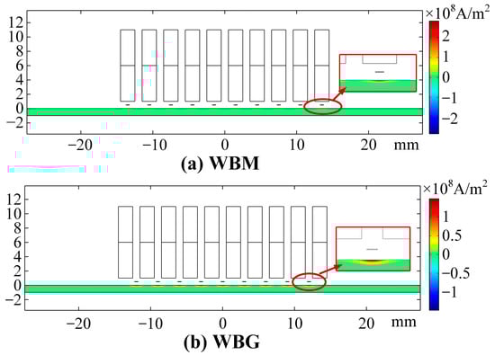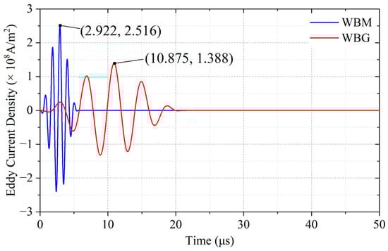 The eddy current density Jiz at P0 is shown in Figure 7. In the WBM model, the eddy current reaches the maximum of 2.516 × 108 A/m2 at 2.922 μs. Figure 8a shows the eddy current distribution in the WBM model at 2.922 μs. In the WBG model, the eddy current reaches the maximum of 1.388 × 108 A/m2 at 10.875 μs. Figure 8b shows the eddy current distribution in the WBG model at 2.922 μs. Due to the different excitation frequencies, the eddy current in the WBM model has a larger maximum value and a smaller skin depth than those in the WBG model, as shown in Figure 8. The skin depth is expressed by