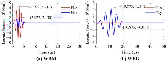 The Lorentz force density FL at P0 is shown in Figure 9. It is obvious that the magnitudes of Lorentz forces at P0 vary with the eddy currents. Different positions of the coils result in different directions of Lorentz forces. In the WBM model, the wires are aligned with the magnet units. It is the horizontal Lorentz forces FLx, resulting from the interaction between the vertical magnetic field and the eddy currents, that generate the Lamb waves. As shown in Figure 9a, the maximum values of FLx and FLy are 6.715 × 107 N/m3 and 2.130 × 107 N/m3, respectively. The ratio of the maximum values of FLx to that of FLy (ηWBM(x_y)) is about 3.15.