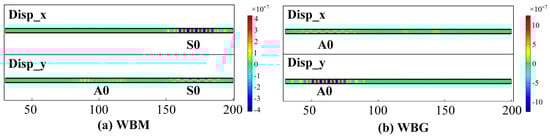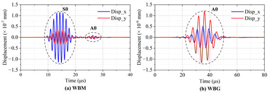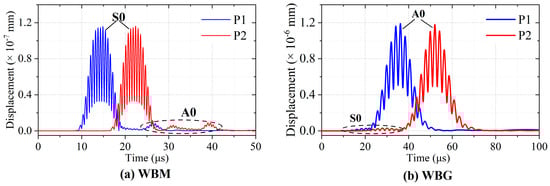 Furthermore, the mode of the wave is verified by the wave velocity. Figure 14 shows the total displacements at P1 and P2. The distance between P1 and P2 is 40 mm. In Figure 14a,b, the simulated velocity is 5333 m/s and 2526 m/s, close to the theoretical group velocity of S0 (5400 m/s) and A0 (2448 m/s) mode, respectively. This indicates that the WBM model mainly excites S0 mode Lamb waves, and the WBG model mainly excites A0 mode Lamb waves in the aluminium plate.