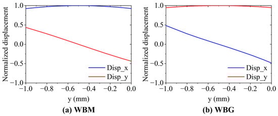 Normalized displacement on the line at x = 60 mm along the plate thickness in (a) the WBM model at 14.5 μs and (b) the WBG model at 32.5 μs.
