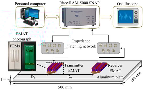 In this section, EMATs were fabricated to implement the ultrasonic experiments. A schematic diagram of the experimental system is shown in Figure 15. The size of the aluminium plate is 500 mm × 180 mm × 1 mm. A pair of EMATs with identical structures is used as the transmitter and receiver. D0 is the distance between the transmitter and the receiver, and D1 is the distance from the transmitter to the left edge of the aluminium plate. The Ritec RAM-5000 SNAP system is employed to generate high-voltage pulse signals and to receive electrical signals controlled by means of a personal computer. Impedance-matching networks (TEM-128 Transmit EMAT Matching Network and REMP-128 Receive EMAT Matching Network) are added to the transmitter and receiver to improve the energy conversion efficiency of the transducers. A digital oscilloscope (Tektronix MDO3012 Mixed Domain Oscilloscope) is adopted to display and store electrical signals.
