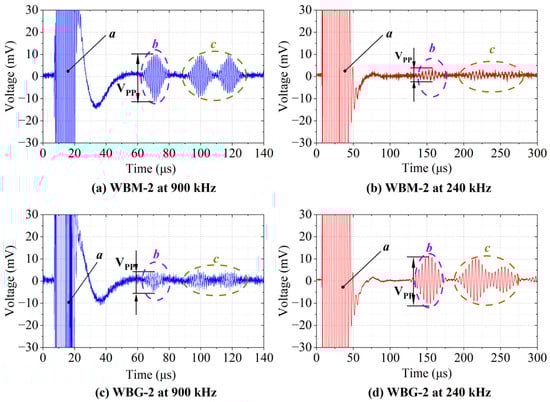 Signals received by the WBM-2 and WBG-2 EMATs. (a) Signal of WBM−2 EAMT at 900 kHz. (b) Signal of WBM-2 EMAT at 240 kHz. (c) Signal of WBG-2 EMAT at 900 kHz. (d) Signal of WBG-2 EMAT at 240 kHz. Packets a are the crosstalk signals, packets b are the direct waves, and packets c are echoes reflected by the left and right edges of the aluminium plate. VPP is the peak-to-peak value of packets b.
