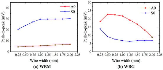The amplitude (VPP) of the direct waves received by the WBM and WBG EMATs with different wire widths is shown in Figure 18. In WBM EMATs, the amplitude of S0 modes is always larger than that of A0 modes. While in WBG EMATs, the amplitude of S0 modes is always smaller than that of A0 modes. Moreover, in Figure 18a, the amplitude of both S0 and A0 mode waves received by WBM EMATs increases with the increasing wire width. The increase in the amplitude of the S0 mode is more pronounced than that of the A0 mode for wire width below 1 mm. Then, the amplitude of the S0 mode remains almost constant, while that of the A0 mode still slightly increases with increasing wire width. The dependence of the Lamb wave amplitude on the wire width is quite different for the WBM EMAT (Figure 8b). The amplitude of S0 mode first decreases with increasing wire width and then reaches a stable value above a wire width of 1 mm. The amplitude of the A0 mode increases with increasing wire width when the latter is smaller than 0.5 mm and then starts to decrease above a wire width of 0.5 mm.