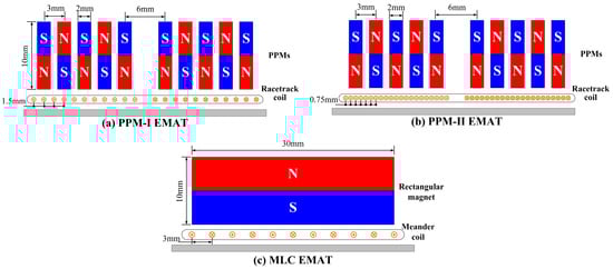 Structure diagram of developed PPM EMATs and conventional MLC EMAT. (a) PPM-Ⅰ EMAT, the coil is a racetrack coil with wire spacing of 1.5 mm. (b) PPM-Ⅱ EMAT, the coil is a racetrack coil with wire spacing of 0.75 mm. (c) MLC EMAT, the coil is a meander coil with wire spacing of 3 mm.