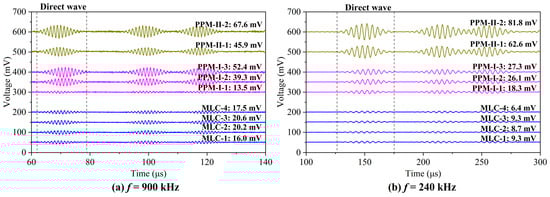 Received signals of the MLC and PPM EMATs at (a) 900 kHz and (b) 240 kHz.