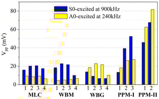 The signals received by the three types of EMATs at frequencies of 900 kHz and 240 kHz are shown in Figure 20. It can be seen that the coexistence of horizontal and vertical Lorentz force does not affect the purity of A0 and S0 mode Lamb waves due to constructive and destructive interference. S0 and A0 modes dominate the Lamb waves excited at 900 kHz and 240 kHz by each type of EMAT, respectively. The peak-to-peak values (Vpp) of the direct wave packets in the received signals are calculated and shown in Figure 21.