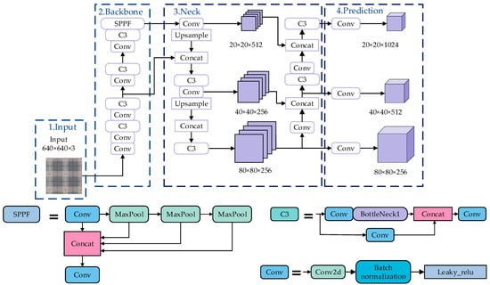 Considering that the pixel size occupied by the small fabric defect targets is extremely small, to further strengthen the detection accuracy of small objects, we improve the algorithm to increase the number of upsamples to improve the lower-level feature information. Four-scale detection is formed by adding a 160 × 160 detection layer. The improved detection was shown in Figure 6. For the 640 × 640 input image, the detection layer can detect the 4 × 4 size target, which further improves the ability to extract small pixel defects in the fabric image.