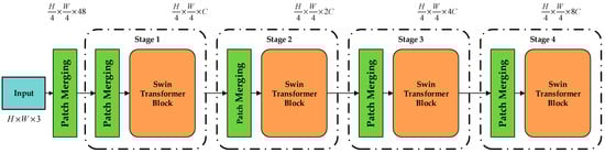 The workflow is as follows: (1) The Swin Transformer first inputs an RGB three-channel image of size H × W. It divides the input image into 4 × 4 patches through the segmentation layer, and its feature dimension is divided into h/4 × h/4. (2) In the process of Stage 1, the dimension of the output is changed to C through linear embedding, and then dispatches the Transformer block for Stage 2. (3) The purpose of Stage 2 to Stage 4 is the same. After the 2 × 2 adjacent blocks are spliced through image block patch merging, the spliced high-dimensional features are then reduced in dimension through a convolution, and the output dimension becomes 2C. Then, Stage 3 is repeated 6 times, and the output after dimensionality reduction is 4C. Stage 4 is repeated twice, and the output dimension becomes 8C.