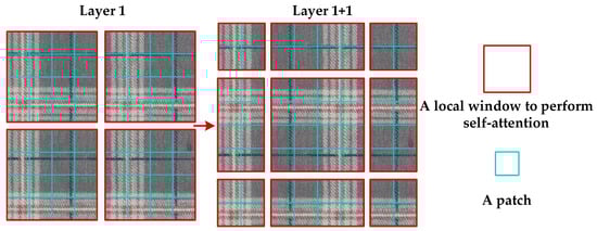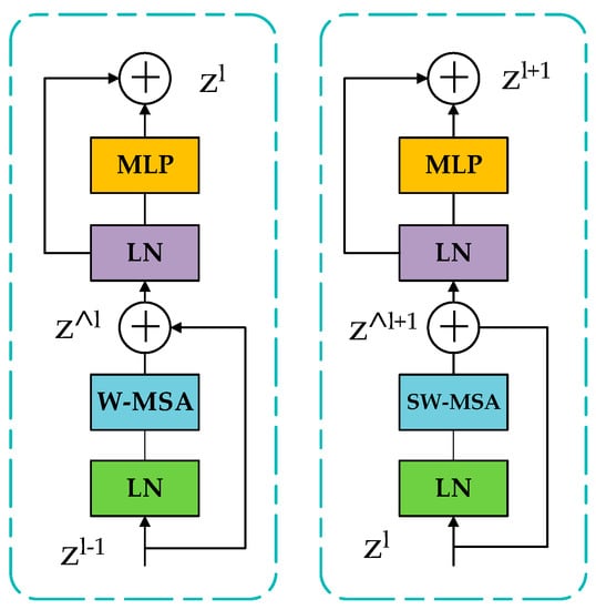 In Formulas (1) to (4) above, ẑ represents the feature output by MLP, and zl is the output feature of W-MAS. W-SMA is a traditional window-partitioned self-attention mechanism, while SW-MSA represents a multihead self-attention mechanism using shifted window partitions. By introducing adjacent nonoverlapping windows in the upper layer, the connection between each layer is increased and the classification accuracy is improved.