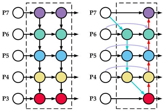 The size of some defects in the fabric is too small, which will cause the feature information extracted by YOLOv5 to ignore the small defect information. In order to strengthen the feature fusion between different scales and increase the detection accuracy, this paper introduces a weighted bidirectional feature network [27] (bidirectional feature network), which uses weighted feature fusion and cross-scale connections to obtain multiple levels. The global features of semantic information can strengthen the recognition accuracy of small object defects. The structure of the BiFPN is shown in Figure 5.