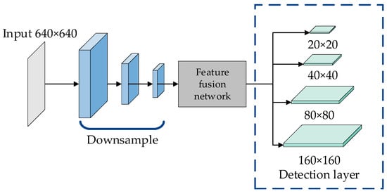 Feature maps of 3 different sizes are used in the original YOLOv5 network results to detect objects with inconsistent sizes. When we set the input image size to 640 × 640, after a series of convolution and sampling operations, the size of the output detection feature map is 20 × 20, 40 × 40, and 80 × 80, which can detect 32 × 32, 16 × 16, and 8 × 8 targets respectively.