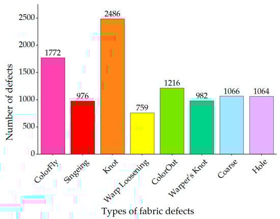 The data set used in the experiment were taken by Alibaba Cloud Tianchi [30] in a textile workshop in Guangdong Province. After manual sorting and selection, 10,321 pictures were selected, including 8 kinds of defects. They are ColorFly, Singeing, Knot, Warp Loosening, ColorOut, Warper’s Knot, Hole, and Coarse. An example of each type of fabric defect is shown Figure 7. The specific number of fabric faults is shown in Figure 8.