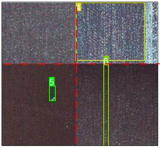 Due to the low number of certain kinds of defects in the original fabric dataset, it may cause underfitting of this type of defect. In this paper, methods such as flipping, zooming, adding noise, splicing, and mosaic enhancement are used to expand the number of some fabric images. The effect of mosaic data enhancement is shown in Figure 10. Combining four different fabric pictures enables the model to learn various types of features during each training, thereby improving the detection and generalization capabilities of the model, and consecutive effects of the imbalance in the number of fabrics.