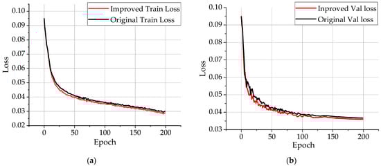 Figure 11 shows the variation of loss value with epoch during training of the benchmark network and the improved network. Based on the loss function graph, we know that the loss decreases rapidly during the 25 epochs of training, and the loss decreases gradually and becomes smooth after 150 epochs after training. It can be shown that the network training has not occurred overfitting. The loss of the improved model training and validation has a higher drop rate, indicating that the training effect of the improved model is better than the baseline model.