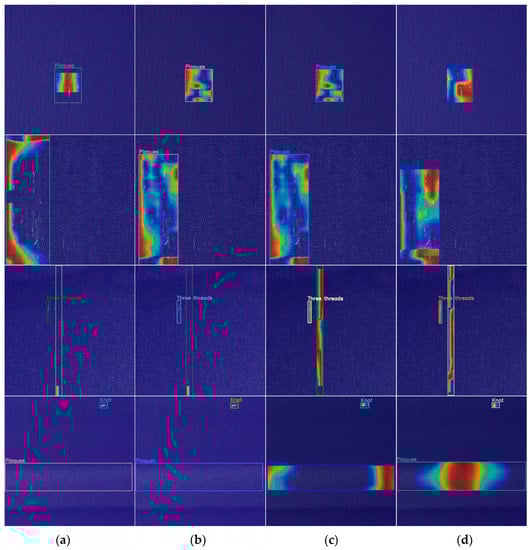 This attention mechanism can explicitly show the area that the model pays attention to focus on. From the experimental results, it can be seen that after adding the Transformer’s self-focus mechanism, mAP has increased, which can effectively strengthen the feature extraction capability of the model for low-resolution images, help to retain the feature information of fabric defects, and strengthen the network’s ability to detect features around small defects. After introducing the GAM attention to the neck, the extraction ability of small objects is further improved.
