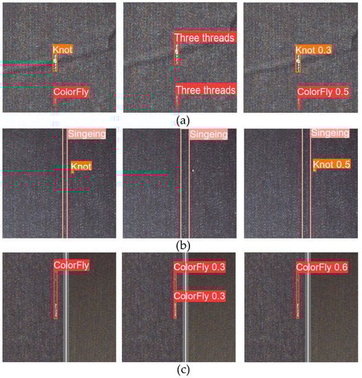 Some visual detection results. The first picture on the left is the labeled picture, the middle picture is the detection result of the original YOLOv5 algorithm, and the picture on the right is the detection result of the improved algorithm: (a) Detection result of the similar appearance of two kinds of fabric defects; (b) detection result of small target size defects; (c) detection result of overlapping fabric defects.
