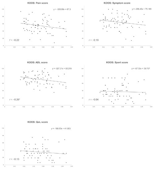 The association between the VT-index and each KOOS score, and the results of the linear regression analyses are shown using scatter plots and regression lines in Figure 2. Pearson’s correlation coefficients were −0.22 (p = 0.07), −0.19 (p = 0.12), −0.26 (p = 0.03), −0.04 (p = 0.74), and −0.13 (p = 0.30) for the pain, symptoms, ADL, Sport, and QoL scores, respectively.