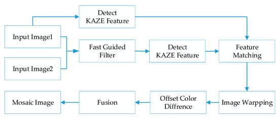In this paper, we propose an improved image stitching algorithm based on color difference and KAZE with a fast guided filter, which solves the problems of a high mismatch rate in feature matching and obvious seams in the stitched image. In this paper, a fast guide filter is introduced to reduce the mismatch rate before matching. The KAZE algorithm based on RANSAC is used for feature matching of the image to be spliced, and the matrix transformation of the image to be spliced is performed. Then, the color difference and brightness difference of the overlapping area of the image to be spliced is calculated, and overall adjustments of the image to be spliced are made so as to improve the nonuniformity of the spliced image. Finally, the converted image is fused to obtain the stitched image.