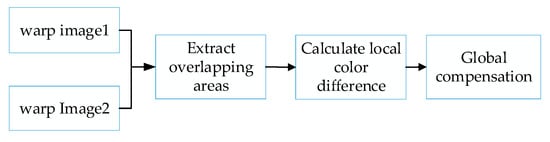 The luminance and color of the image to be stitched may be uneven, which can easily result in obvious stitching seams in the stitching result. To improve this problem, we put forward a color difference compensation method. The process is shown in Figure 5.
