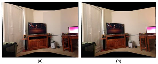 Currently, image stitching is still a topical research issue and is widely used in computer vision, unmanned aerial vehicle (UAV) reconnaissance and other fields [,]. Image stitching consists of synthesizing different types of images captured by different imaging devices at different shooting positions into an image with a larger field of vision [,]. On the one hand, image stitching can synthesize panoramic and ultra-wide-view images, so that ordinary cameras can achieve grand scene shooting. On the other hand, image stitching can synthesize fragmented images into a complete image. The stitching technology can be applied to combine medical images, scientific microscope fragments or local images from seabed exploration into a complete image. In addition, image mosaic is also a basic technology in scene rendering methods, which uses panoramic images instead of 3D scenes to model and draw. However, image stitching still encounters many challenges at present, such as parallax caused by viewpoint change, ghosting, distortion, detail distortion and image unevenness [,,].
