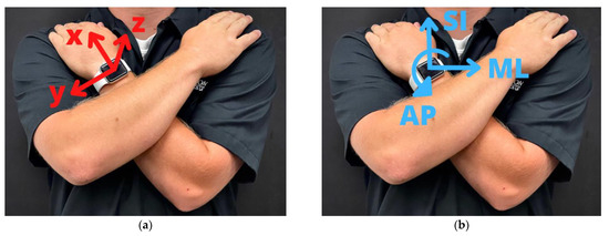 The functional calibration algorithm employed in this study is based on principal component analysis (PCA). Two recent biomechanics studies have utilized a PCA-based calibration algorithm that allows an IMU to align itself with a single global axis based on movement known to be one-dimensional [15,16]. Other studies have also used a gravity vector to find a second reference axis, and then a cross product to find the third global axis [13,17]. This paper similarly reports the combination of a PCA maneuver, gravity vector, and cross product that aligns a smartwatch’s IMU in all three directions.