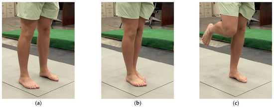 Images of different pose difficulties. (a) Both-legs stance; expected to be the least difficult. (b) Semi-tandem stance; expected to have moderate difficulty. (c) Single-leg stance; expected to be the most difficult.