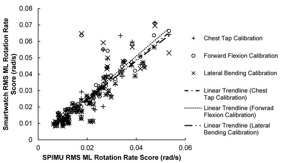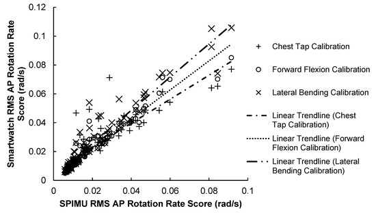 84 RMS AP rotation rate scores between smartwatch versus SPIMU. A positive trendline was produced with every calibration method.