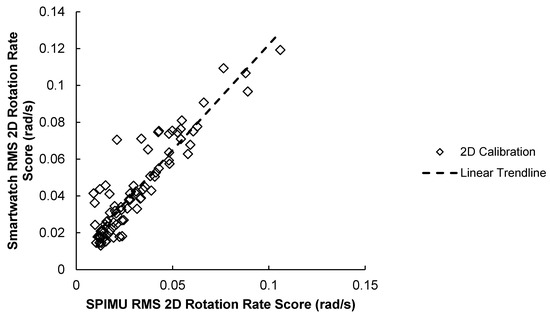 84 RMS 2D rotation rate scores between smartwatch versus SPIMU. A positive trendline was produced.