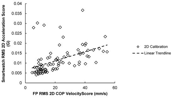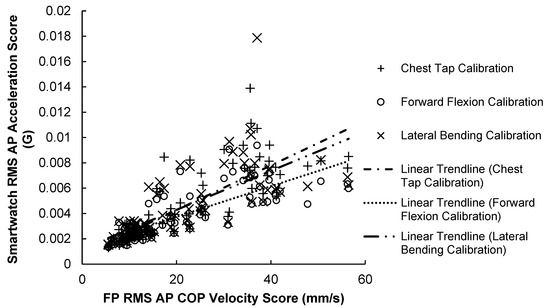84 Smartwatch RMS AP acceleration scores versus force-plate RMS AP COP velocity scores. A positive trendline was produced with every calibration method.