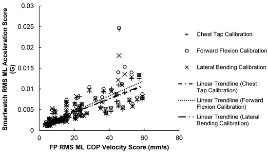 84 Smartwatch RMS ML acceleration scores versus force-plate RMS ML COP velocity scores. A positive trendline was produced with every calibration method.