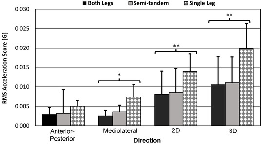RMS acceleration score bar graphs. Bar graphs show sample mean; error bars indicate one standard deviation. Significance level was corrected to αe = 0.0026. RMANOVA test results were significant for ML (p < 0.001), 2D (p = 0.002), and 3D (p < 0.001) scores. * = significant variation in the mean scores by pose type. ** = significant equal variation in the mean scores by pose type.