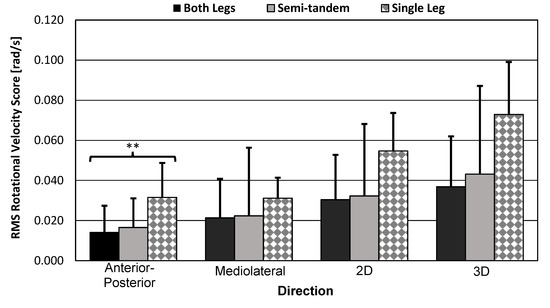 RMS rotational velocity score bar graphs. Bar graphs show sample mean; error bars indicate one standard deviation. Significance level was corrected αe = 0.0026. RMANOVA test results were significant for AP scores only (p < 0.001). ** = significant equal variation in the mean scores by pose type.