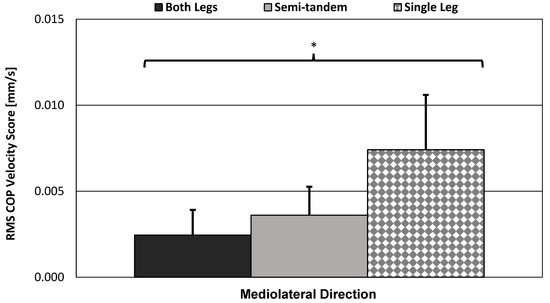 Force plate’s RMS ML COP velocity bar graphs. Bar graphs show sample mean; error bars indicate one standard deviation. Significance level was corrected to αe = 0.0026. RMANOVA results showed significant variation in the mean scores by pose type, but sphericity was violated even in best case (Factor DOF = 1.10, F = 83.23, p < 0.001). * = significant variation in the mean scores by pose type.