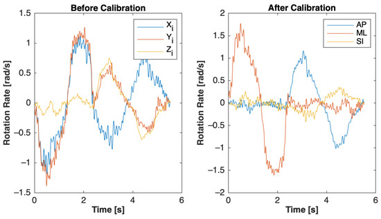 The uncalibrated data were projected to the newly found global axis target with the dot product (see Equations (13) and (14)). Since there were two other calibration maneuvers, these data were saved and marked as AP axis data found with chest-tap calibration.