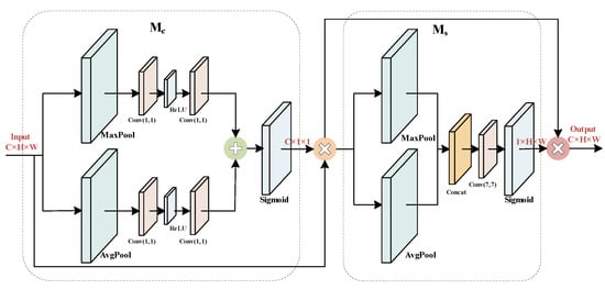 The module operation process and the output can be expressed as (1) and (2), where F is the feature map of the input, is the channel attention mechanism, and is the spatial attention mechanism. denotes the add operation, and denotes element-wise multiplication. F″ denotes the final output feature map after the CBAM attention module. The output of the CBAM module is shown in Equations (1) and (2) as follows:
