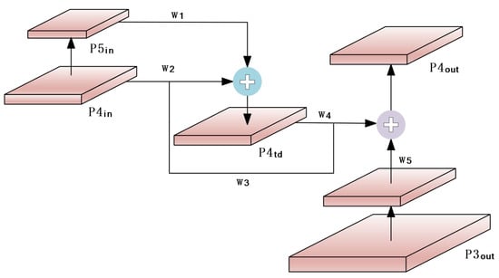 In the feature fusion process, deep features and shallow features have different resolutions when fused across scales, and this difference directly affects the output results. The FPN-PAN structure of YOLOv5 uses an equivalent fusion strategy for input feature maps from different scales, while the Bi-FPN structure introduces adaptive weights in the feature fusion process at different scales, and adaptive weights can be gradually adjusted with deeper training, allowing the network to learn and enhance the differentiation ability of input feature importance, and to suppress or enhance different input features according to the weights, balancing the feature information between different scales. Its weighting formula is shown in Equation (3):